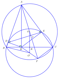 c) Gọi \(O'\) là tâm đường tròn ngoại tiếp \(\Delta BDE.\) Chứng minh \(O'\) là trung điểm của đoạn thẳng \(HF.\)