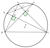 Cho tam giác \(ABC\,\left( {AB < AC} \right)\) có ba góc nhọn nội tiếp đường tròn \(\left( O \right).\) Lấy các điểm \(P,Q\) lần lượt thuộc các cung nhỏ \(AC\) và \(AB\) sao cho \(BP\) vuông góc với \(AC,CQ\) vuông góc với \(AB.\) Gọi \(I,J\) lần lượt là giao điểm của \(PQ\) với \(AB\) và \(AC.\) Chứng minh \(IJ.AC = AI.CB.\)