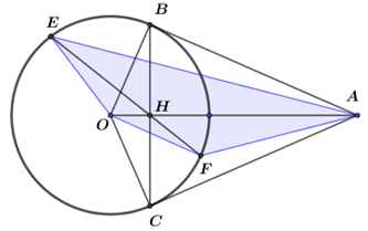 Từ điểm \(A\) nằm ngoài đường tròn \(\left( O \right)\) kẻ các tiếp tuyến \(AB,AC\) đến đường tròn \((B,C\) là tiếp điểm). Gọi \(H\) là giao điểm của \(OA\) và \(BC\).
