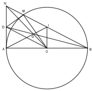 c) Qua \(O\) kẻ đường thẳng vuông góc với \(AB\) và cắt đường thẳng \(BM\) tại \(I\). Gọi giao điểm của \(AI\) và \(BD\) là \(G\). Chứng minh \(N,\,\,G,\,\,O\) thẳng hàng.