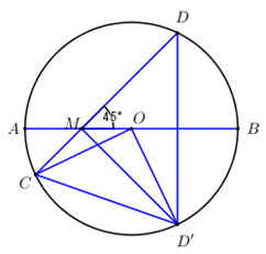 Cho đường tròn \(\left( {O;R} \right)\) đường kính \(AB\). Điểm \(M\) nằm trên \(AB\). Qua \(M\) kẻ dây \(CD\) tạo với \(AB\) một góc \({45^0}\). Gọi \(D'\) là điểm đối xứng của \(D\) qua \(AB\). Tính \(M{C^2} + MD{'^2}\) theo \(R\)?