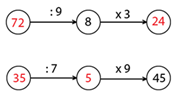 Quan sát sơ đồ ta biết được: \(A:9 = 8;\,\,\,\,8 \times 3 = B\) và \(M:7 = N;\,\,\,N \times 9 = 45\)