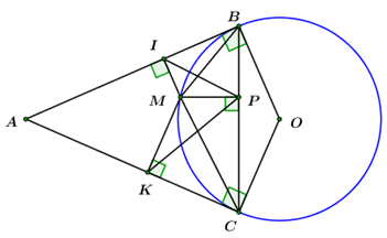 Từ một điểm A nằm ngoài đường tròn tâm O bán kính R, kể các tiếp tuyến \(AB,\,\,AC\) với đường tròn (B, C là các tiếp điểm). Trên cung nhỏ BC lấy một điểm M bất kì khác B và C. Gọi \(I,\,\,K,\,\,P\) lần lượt là hình chiếu vuông góc của điểm M trên các đoạn thẳng \(AB,\,\,AC,\,\,BC\).