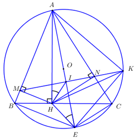 Cho tam giác ABC có ba góc nhọn \(\left( {AB < AC} \right)\) và nội tiếp đường tròn \(\left( O \right)\). Vẽ đường cao \(AH\,\,\left( {H \in BC} \right)\), từ \(H\) kẻ \(HM\) vuông góc với \(AB\,\,\left( {M \in AB} \right)\) và kẻ \(HN\) vuông góc với \(AC\,\,\left( {N \in AC} \right)\). Vẽ đường kính \(AE\) của đường tròn \(\left( O \right)\) và cắt \(MN\) tại \(I\), tia \(MN\) cắt đường tròn \(\left( O \right)\) tại \(K\).