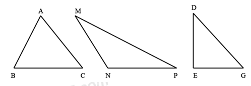 Quan sát hình vẽ, nhận biết góc vuông và góc không vuông trong mỗi tam giác.
