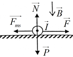 Hai thanh ray nằm ngang song song cách nhau \(0,3cm\), đặt trong từ trường có cảm ứng từ vuông góc với mặt phẳng hai thanh ray, hướng từ trên xuống. Cho dòng điện \(50A\) chạy qua thanh kim loại đặt lên hai thanh ray. Biết hệ số ma sát giữa thanh kim loại và thanh ray là \(\mu = 0,2\) và khối lượng thanh kim loại là \(0,5kg\). Tìm điều kiện về độ lớn của cảm ứng từ B để thanh kim loại có thể chuyển động.