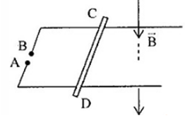 Hai thanh ray nằm ngang song song cách nhau \(0,3cm\), đặt trong từ trường có cảm ứng từ vuông góc