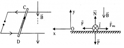Thanh kim loại CD có chiều dài \(L = 20cm\) khối lượng \(m = 100g\) đặt vuông góc với 2 thanh ray song song nằm ngang và nối với nguồn điện như hình vẽ. Hệ thống đặt trong từ trường đều có \(B = 0,2T\) phương chiều như hình vẽ. Biết hệ số mà sát giữa CD và thanh ray là \(\mu = 0,1\). Bỏ qua điện trở các thanh ray, điện trở tại nơi tiếp xúc và dòng điện cảm ứng trong mạch. Biết thanh ray trượt sang trái với gia tốc \(a = 3m/{s^2}\). Xác định chiều và độ lớn của dòng điện qua CD.