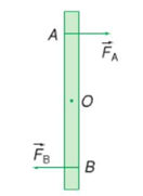 Một chiếc thước mảnh có trục quay nằm ngang đi qua trọng tâm \(O\) của thước. Dùng hai ngón tay tác dụng vào thước một ngẫu lực đặt vào hai điểm A và B cách nhau \(4,5cm\) và có độ lớn \({F_A} = {F_B} = 1N\) (Hình vẽ). Tính momen của ngẫu lực?