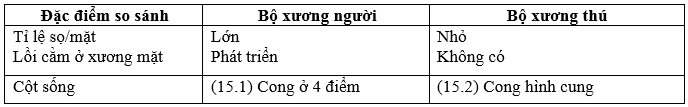 Từ câu 15-19, chọn các phương án đúng để hoàn thiện bảng so sánh giữa bộ xương người và bộ xương thú: