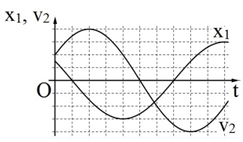 Hai vật M1 và M2 dao động điều hòa cùng tần số. Hình bên là đồ thị biểu diễn sự phụ thuộc của li độ x1 của M1 và vận tốc v2 của M2 theo thời gian t . Hai dao động của M2 và M1 lệch pha nhau: