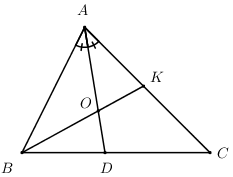 Cho \(\Delta ABC\) có \(AB = 4cm,\,AC = 6cm,\) đường phân giác trong \(AD\left( {D \in BC} \right)\) . Trên đoạn \(AD\) lấy điểm \(O\) sao cho \(AO = 2OD.\) Gọi \(K\) là giao điểm của \(BO\) và \(AC\) . Tỉ số \(\frac{{AK}}{{KC}}\) bằng