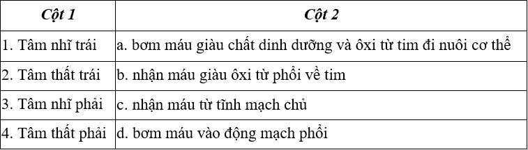 4. Tâm thất phải         d. bơm máu vào động mạch phổi