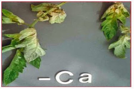 Biểu hiện cây trồng thiếu Canxi (Cây có màu xanh đậm, chồi non mất màu xanh, cong và chết dần ở chóp lá và mép lá, cuối cùng chồi ngọn chết).