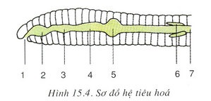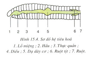 Hoàn thành hệ tiêu hóa của giun đất dựa vào hình sau: Số 1, 2, 3, 4 trên hình 15.4 lần lượt