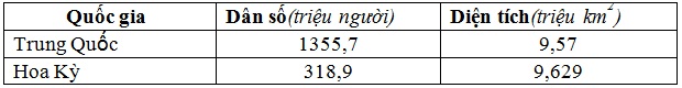 Cho bảng số liệu về dân số và diện tích của Trung Quốc và Hoa Kỳ năm 2015