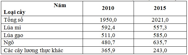 Cho bảng số liệu về sản lượng các loại cây lương thực của thế giới năm 2010 và năm 2015