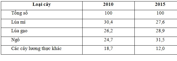 a) Tính tỉ trọng sản lượng các loại cây lương thực trên thế giới năm 2010 và năm 2015.