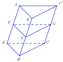 Cho lăng trụ \(ABC.A’B’C’\) . Gọi \(E, F, G\) lần lượt là trung điểm của \(AA’ , BB’, CC’\). Chứng minh rằng các lăng trụ \(ABC.EFG\) và \(EFG.A’B’C’\) bằng nhau.