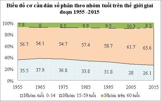 Cho biểu đồ sau: Từ năm 1955 đến 2015, nhìn chung cơ cấu dân số thế
