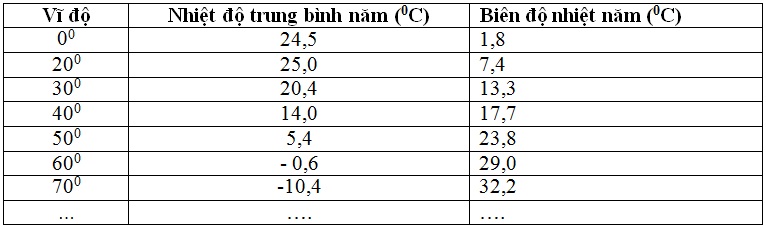 Cho bảng số liệu: SỰ THAY ĐỔI NHIỆT ĐỘ TRUNG BÌNH NĂM VÀ BIÊN ĐỘ NHIỆT NĂM THEO VĨ ĐỘ Ở