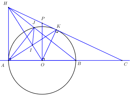 Cho đường tròn \(\left( O \right)\) đường kính \(AB\). Trên đường thẳng \(AB\) lấy điểm \(C\) sao cho \(B\) nằm giữa \(A,C\). Kẻ tiếp tuyến \(CK\) với đường tròn \(\left( O \right)\,\,(K\) là tiếp điểm), tiếp tuyến tại \(A\) của đường tròn \(\left( O \right)\) cắt đường thẳng \(CK\) tại \(H\). Gọi \(I\) là giao điểm của \(OH\) và \(AK,\,\,\,J\) là giao điểm của \(BH\) với đường tròn \(\left( O \right)\,\,(J\) không trùng với \(B\)).