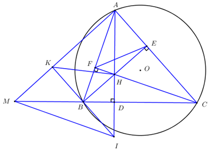 Cho tam giác \(ABC\) nhọn \(\left( {AB < AC} \right)\) nội tiếp đường tròn \(\left( O \right)\). Các đường cao \(AD,\,\,BE,\,\,CF\) cắt nhau tại \(H\).