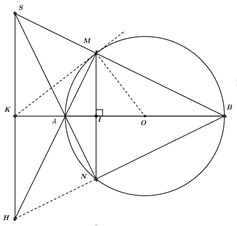 Cho đường tròn \(\left( O \right)\) đường kính \(AB,\) điểm \(I\) nằm giữa hai điểm \(A\) và \(O\,\,\left( {I \ne A,\,\,O} \right).\) Kẻ đường thẳng vuông góc với \(AB\) tại \(I,\) đường thẳng này cắt đường tròn \(\left( O \right)\) tại \(M\) và \(N.\) Gọi \(S\) là giao điểm của hai đường thẳng \(BM\) và \(AN,\) qua \(S\) kẻ đường thẳng song song với \(MN,\) đường thẳng này cắt các đường thẳng \(AB\) và \(AM\) lần lượt tại \(K\) và \(H.\)