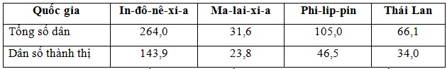 Theo bảng số liệu, nhận xét nào sau đây đúng khi so sánh dân số thành thị của một số quốc gia, năm 2017?