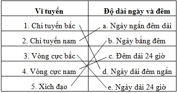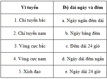 Nối các ý ở cột A sao cho phù hợp với các ý ở cột B: Độ dài ngày và đêm vào ngày