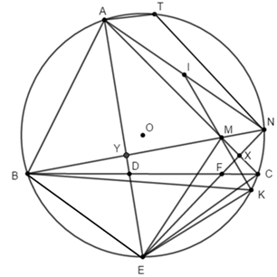Cho tam giác nhọn \(ABC\,\,\,\left( {AB < AC} \right)\) nội tiếp đường tròn tâm \((O)\). Gọi \(E\)là điểm chính giữa cung nhỏ \(BC\). Trên cạnh \(AC\) lấy điểm \(M\) sao cho \(EM = EC\), đường thẳng \(BM\) cắt đường tròn \((O)\) tại \(N\,\,\,\left( {N \ne B} \right).\) Các đường thẳng \(EA\) và \(EN\) cắt cạnh \(BC\)lần lượt tại \(D\) và \(F\).