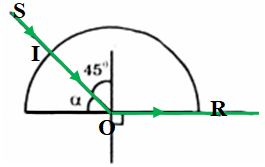 Một khối bán trụ trong suốt có chiết suất \(n = 1,41 \approx \sqrt 2 \). Một chùm tia sáng hẹp nằm trong mặt phẳng của tiết diện vuông góc, chiếu tới khối bán trụ như hình vẽ. Xác định góc khúc xạ ló ra ngoài không khí. Biết \(\alpha = {30^0}\).