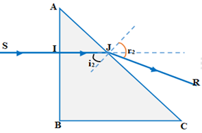 Một khối thủy tinh P có chiết suất \(n=1,5\), tiết diện thẳng là một tam giác cân ABC vuông góc tại B. Chiếu vuông góc tới mặt AB một chùm sáng song song SI. Khối thủy tinh P ở trong nước có chiết suất \(n' = 1,33\). Tính góc D là góc hợp bởi tia ló và tia tới?