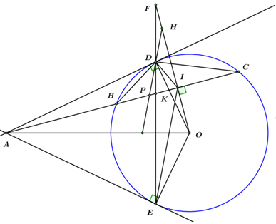 Từ điểm \(A\) nằm bên ngoài đường tròn \((O)\) vẽ hai tiếp tuyến \(AD,\,AE\) (\(D,\,E\)là các tiếp điểm). Vẽ cát tuyến \(ABC\) của đường tròn \((O)\)sao cho điểm \(B\) nằm giữa hai điểm \(A,\,C;\) tia \(AC\)nằm giữa hai tia \(AD\)và \(AO\). Từ điểm \(O\) kẻ \(OI \bot AC\) tại \(I.\)