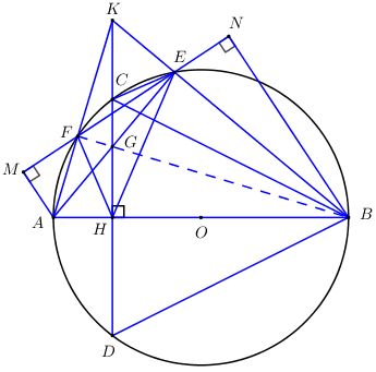d. Gọi \(M,\,\,N\) lần lượt là hình chiếu vuông góc của \(A\) và \(B\) lên đường thẳng \(EF\). Chứng minh \(HE + HF = MN\).
