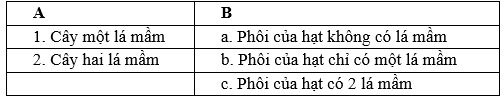 Nối nội dung cột A với nội dung tương ứng của B: 1. Cây một lá mầm a. Phôi của hạt không