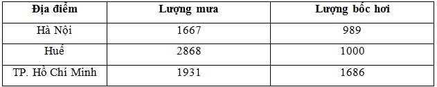 Cho bảng số liệu LƯỢNG MƯA, LƯỢNG BỐC HƠI TẠI MỘT SỐ ĐỊA ĐIỂM (Đơn vị: mm) (Nguồn: