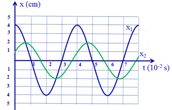 Đồ thị li độ theo thời gian của chất điểm 1 (đường \({{x}_{1}}\)) và chất điểm 2 (đường