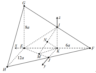 Cho hình tứ diện \(EFGH\) có \(EF\) vuông góc với \(EG\), \(EG\) vuông góc với \(EH\), \(EH\) vuông góc với \(EF\); biết \(EF = 6a,\,\,EG = 8a,\,\,EH = 12a\), với \(a > 0,\,\,a \in \mathbb{R}\). Gọi \(I,\,\,J\) tương ứng là trung điểm của hai cạnh \(FG,\,\,FH\). Tính khoảng cách \(d\) từ điểm \(F\) đến mặt phẳng \(\left( {EIJ} \right)\) theo \(a\).