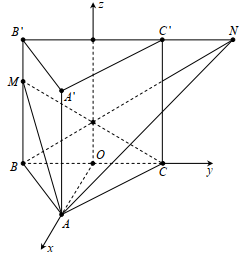+ Gọi \(O\) là trung điểm của \(BC\) và đặt \(BB' = m\). Đặt hệ trục tọa độ sao cho \(O\) là gốc tọa độ.