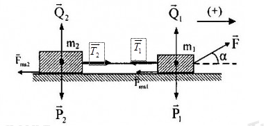 \({m_1} = 1kg;{m_2} = 2kg;{\mu _1} = {\mu _2} = 0,1;F = 6N;\alpha = {30^0};g = 10m/{s^2}\). Tính gia tốc của chuyển động?