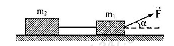 Cho hệ vật như hình vẽ. Với \({m_1} = 1kg;{m_2} = 2kg;{\mu _1} = {\mu _2} = 0,1;F = 6N;\alpha = {30^0};g =