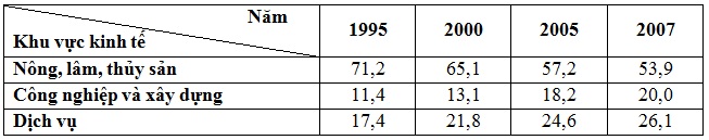 Căn cứ vào bảng số liệu, để thể hiện sự thay đổi cơ cấu sử dụng lao động theo theo khu vực kinh tế ở nước ta 1995 – 2007, biểu đồ nào thích hợp nhất?