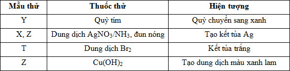 Tiến hành thí nghiệm với các dung dịch X, Y, Z, T. Kết quả thu được ở bảng sau: X, Y, Z, T