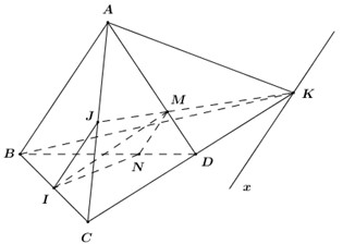 Cho tứ diện \(ABCD.\) Gọi \(I,J\) tương ứng là trung điểm của \(BC,AC.\) Lấy \(M \in AD\) sao cho không trùng với trung điểm \(AD.\)