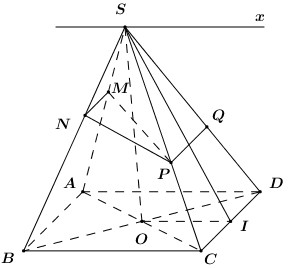 Cho hình chóp \(S.ABCD\) có đáy \(ABCD\) là hình bình hành tâm \(O.\) Trên đoạn \(SA\) lấy điểm \(M\) sao cho \(MA = 2MS;\) trên đoạn \(SB\) lấy điểm \(N\) sao cho \(NB = 2SN.\) Gọi \(I\) là trung điểm của \(CD.\)