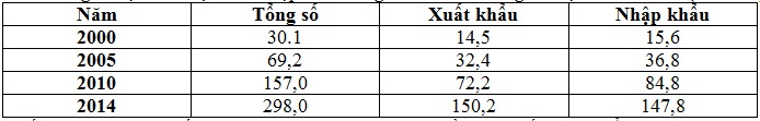 Cho bảng số liệu: Giá trị xuất - nhập khẩu hàng hóa của nước ta giai đoạn 2000 - 2014 ( tỉ