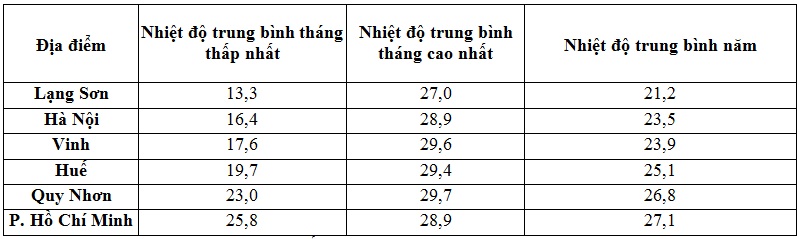 NHIỆT ĐỘ TRUNG BÌNH TẠI MỘT SỐ ĐỊA ĐIỂM( Đơn vị: °C)