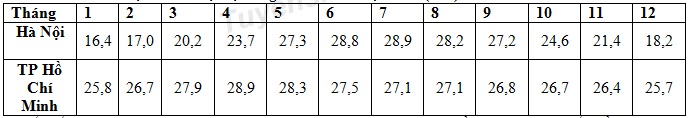 Cho số liệu sau: Nhiệt độ trung bình của các địa điểm (0oC)