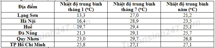 Cho bảng số liệu: Nhiệt độ trung bình tại một số địa điểm